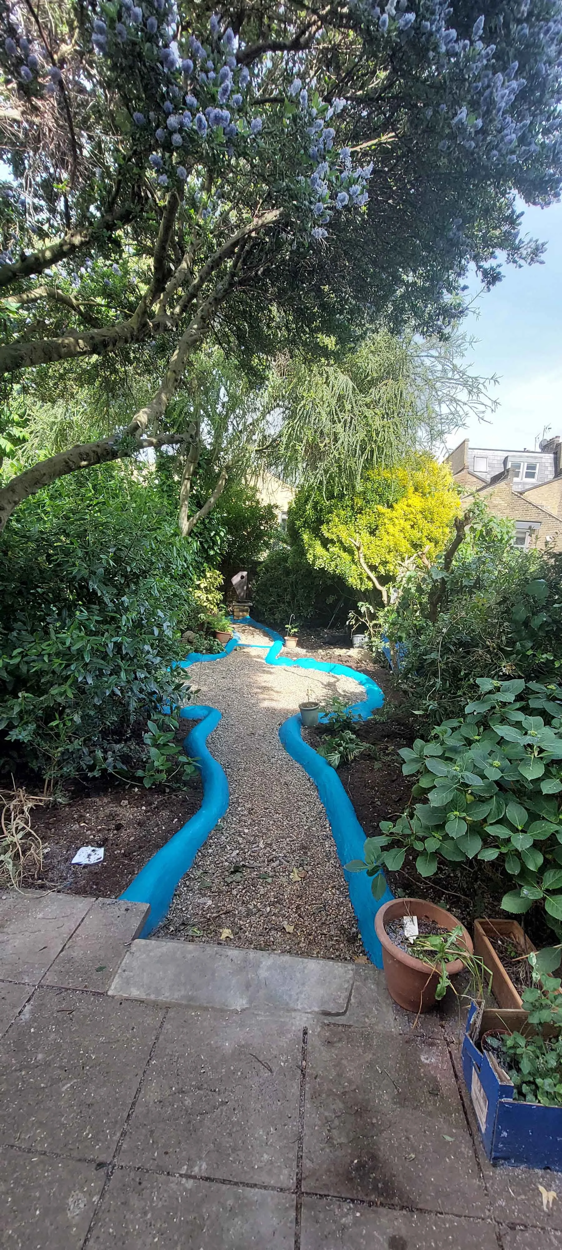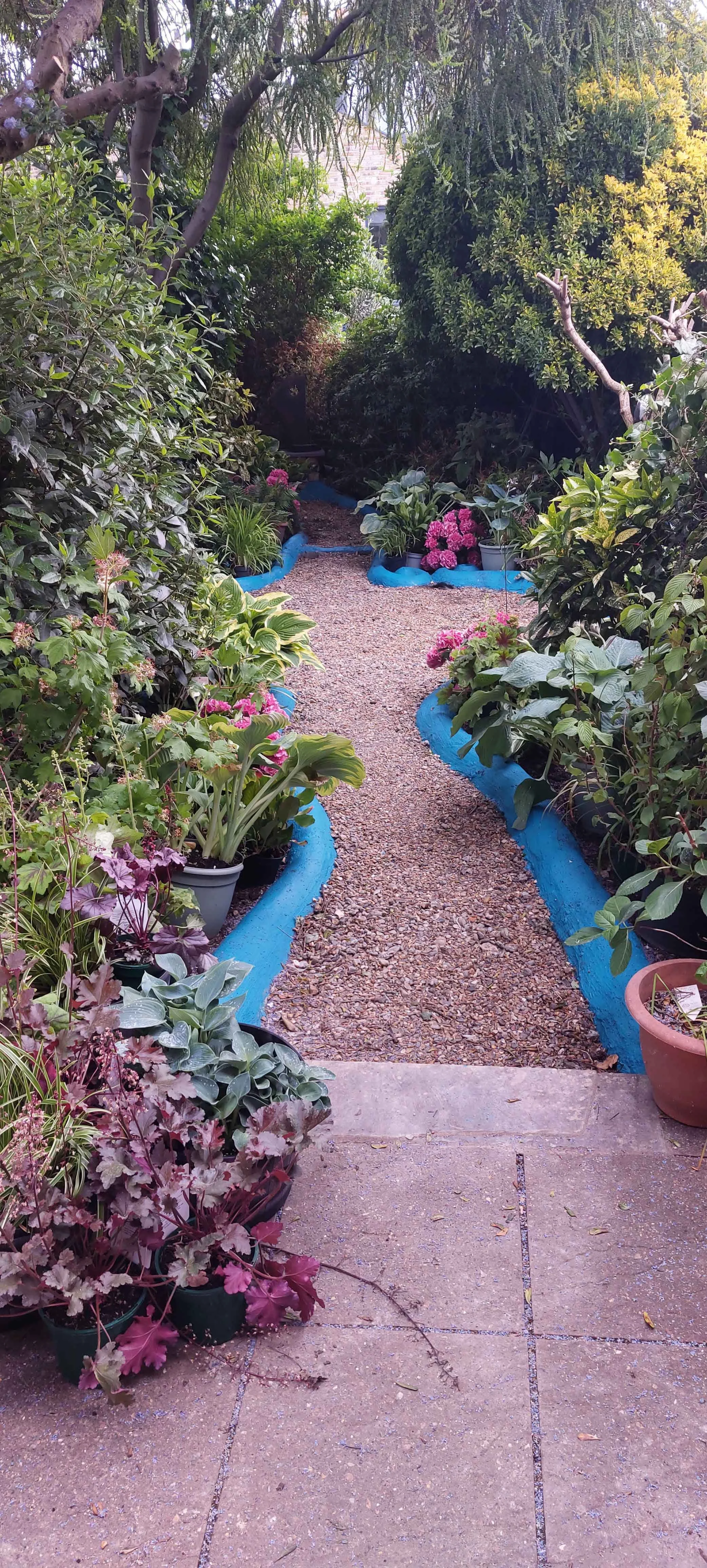 We had a tiny budget and a lot of gravel, so I turned that into fibre reinforced concrete, slurried it with cement and painted it blue. Then I bought loads of shade tolerant plants, added an irrigation system and showed the client how to make concentrated garlic stew to spray on the Hostas to keep the slugs away.